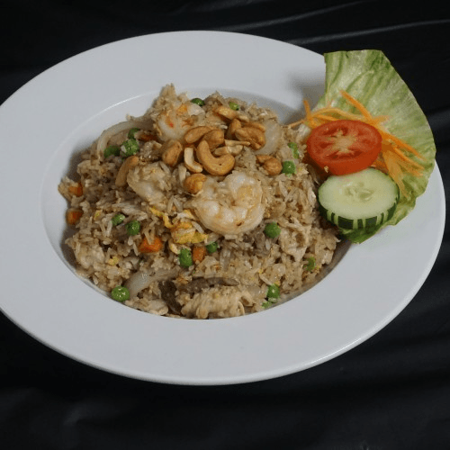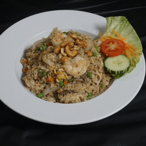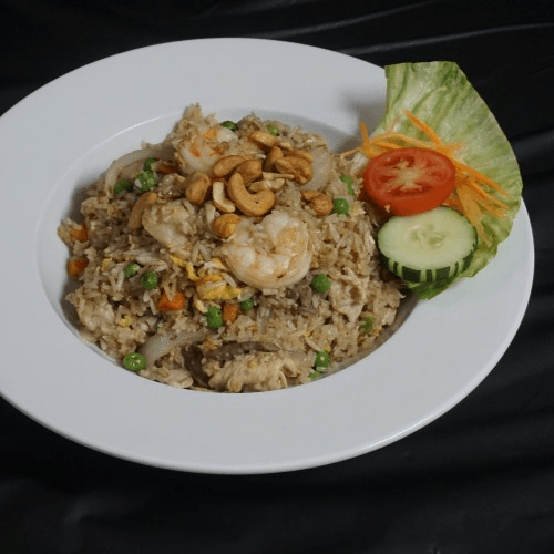 Stir-fried rice mixed with shrimp, beef, chicken, pork, carrot, pea, onion, egg & topped with cashew nut