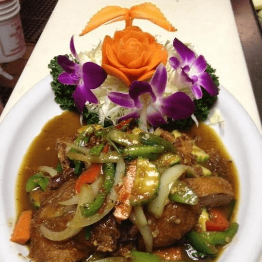 Crispy duck served over steamed bell pepper, onion, broccoli, cabbage, carrot, zucchini topped with chili sauce