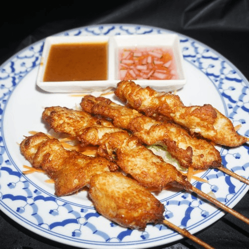 Marinated chicken skewers fried and served with peanut sauce & cucumber sauce, 4 Pieces