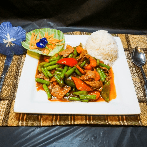 A choice of meat cooked with panang curry paste, coconut milk, peanut paste, broccoli, carrot, zucchini, cabbage and bell pepper
