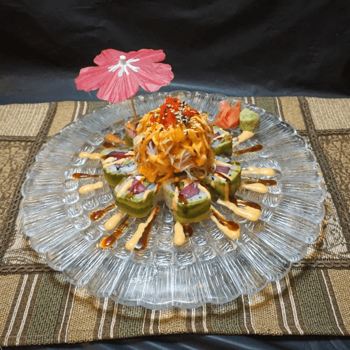 Tuna, avocado, asparagus topped with eel tempura, spicy mayo & black tobiko