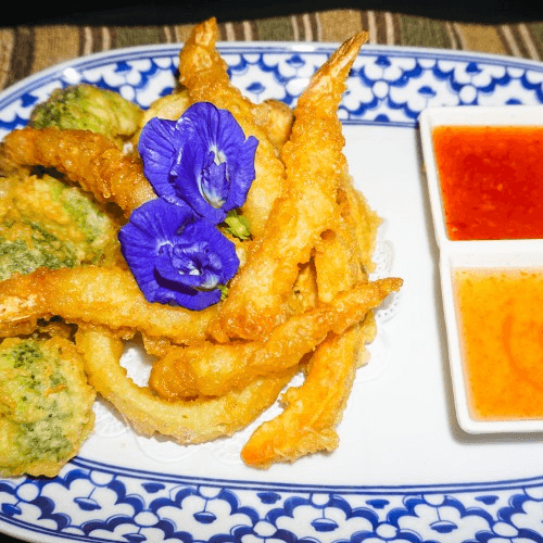 Tempura battered and fried, 5 Pieces with onion, carrot, sweet potato, broccoli