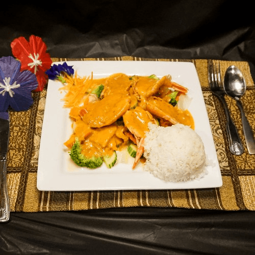 Grilled Jumbo shrimp served over steamed broccoli, cabbage, carrot, zucchini & topped with house special panang sauce