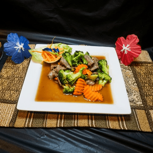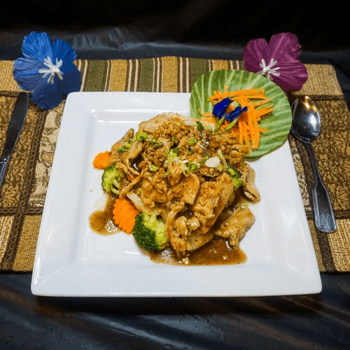 Chicken cooked with broccoli, cabbage, carrot, zucchini in our delectable Bangkok sauce