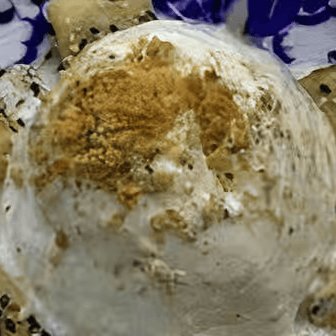 Fried banana pieces and coconut milk with peanut pieces.