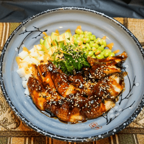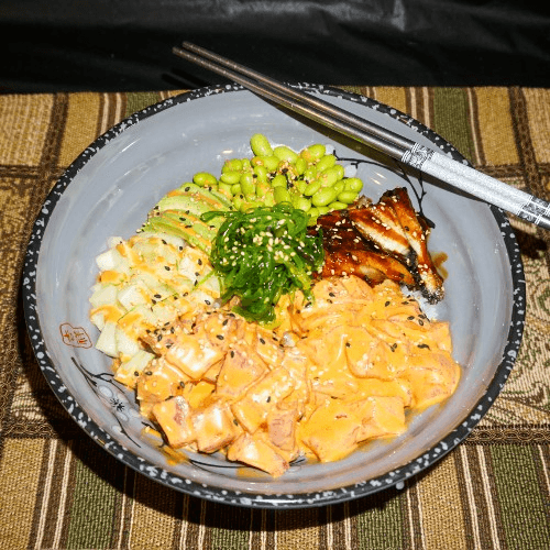 Eel mixed with poke sauce, cucumber, avocado, edamame, and seaweed salad
