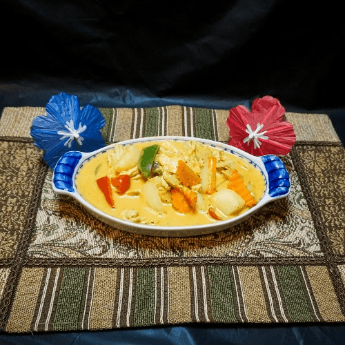 A choice of meat cooked with yellow curry paste, coconut milk