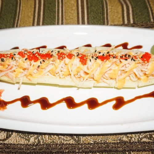 Shrimp tempura, avocado topped with a baked scallop, krab, fish, spicy mayo & smelt roe