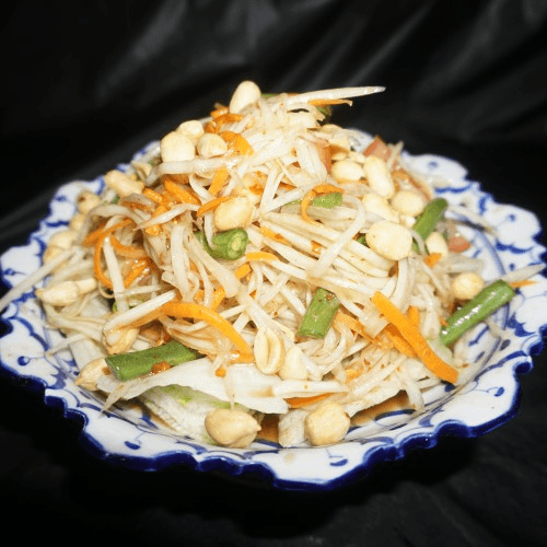 Raw papaya salad with carrot, tomato, green bean, peanut, garlic & tamarind-lime dressing
