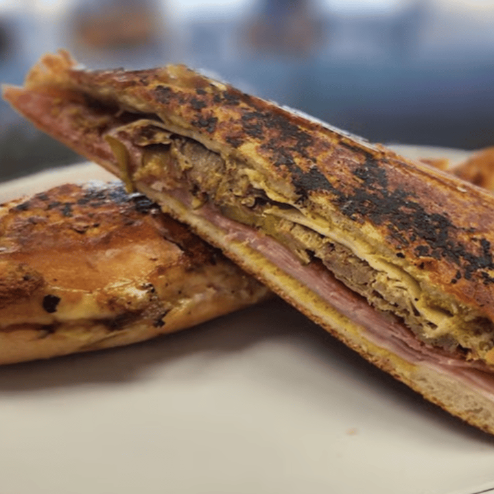 Deluxe ham, Genoa salami, b*** cappy, house pulled pork, gold label Swiss, dill pickle, & spicy brown mustard on authentic Cuban bread