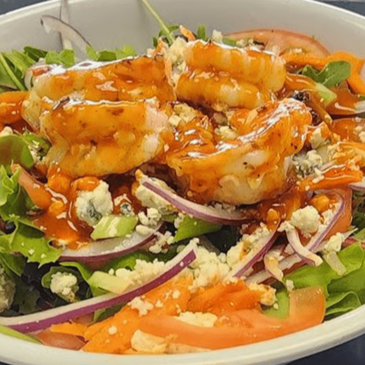 Crispy buffalo chicken or fried jumbo gulf shrimp, blue cheese crumbles, red onion, scallion, tomato, carrot, celery, creamy blue cheese, & garden mix greens