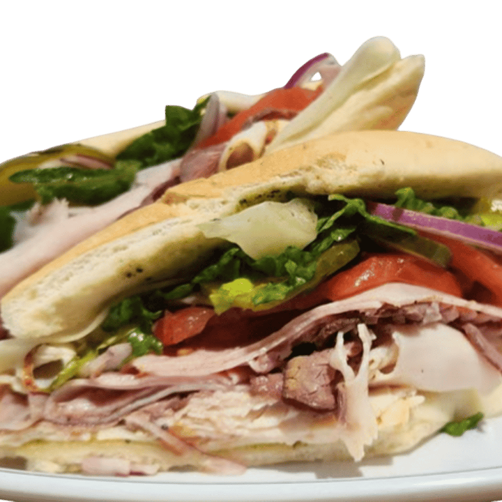 Genoa salami, mortadella, pepperoni, deluxe ham, provolone, black olives, banana peppers, lettuce, tomato, onion, & Italian dressing