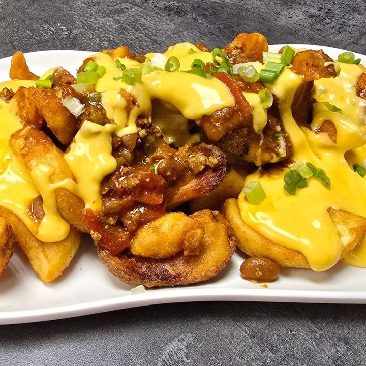 Beer battered french fries topped with homemade chilli, melted Jack cheese, sour cream, & scallions