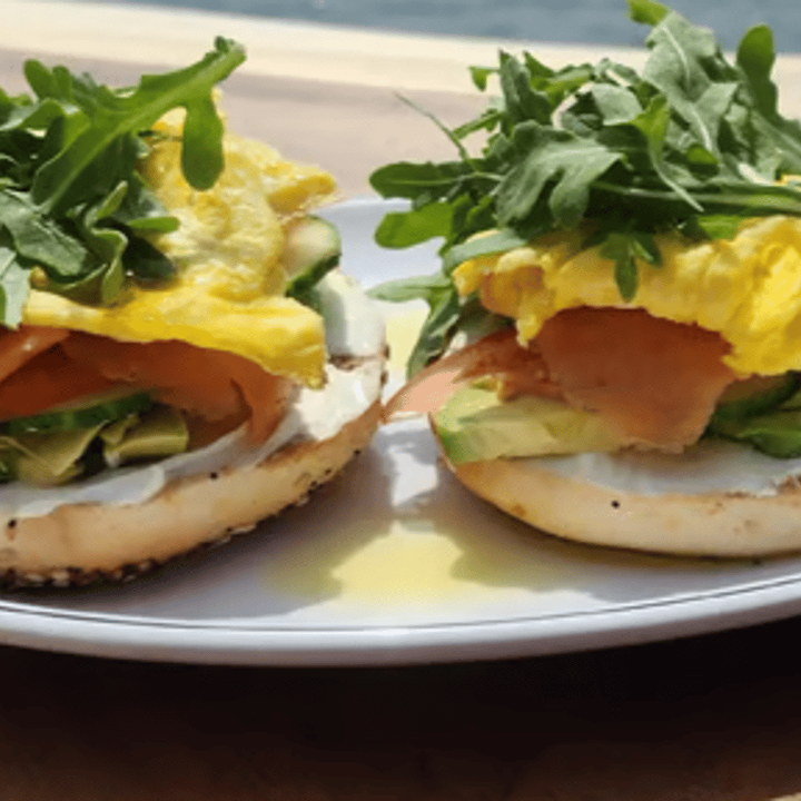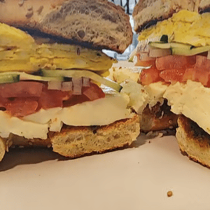 Fresh mozzarella, basil pesto, fresh tomato & arugula with glazed balsamic vinaigrette on your choice of bagel