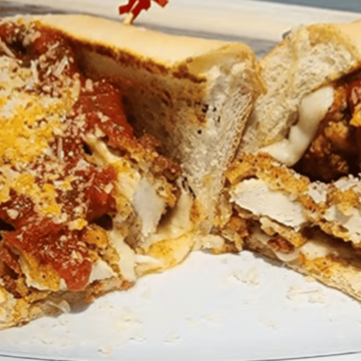 Lightly breaded chicken breast, marinara sauce, and provolone, topped with Parmesan