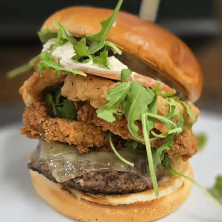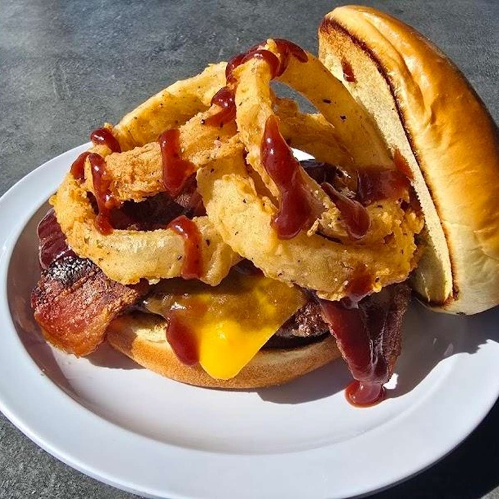 Aged Cheddar, smokey BBQ sauce, applewood smoked bacon, & crispy onion straws