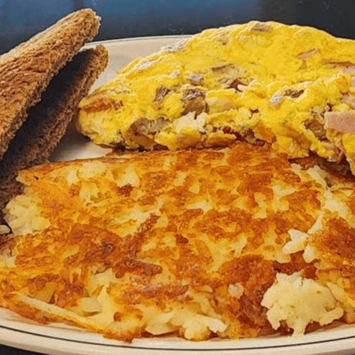 3 eggs, bacon, boars head sausage, 2 buttermilk pancakes, home fries