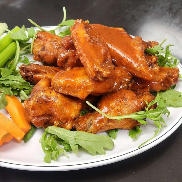 Your choice of spicy buffalo smokey BBQ or teriyaki served with ranch or blue cheese dressing