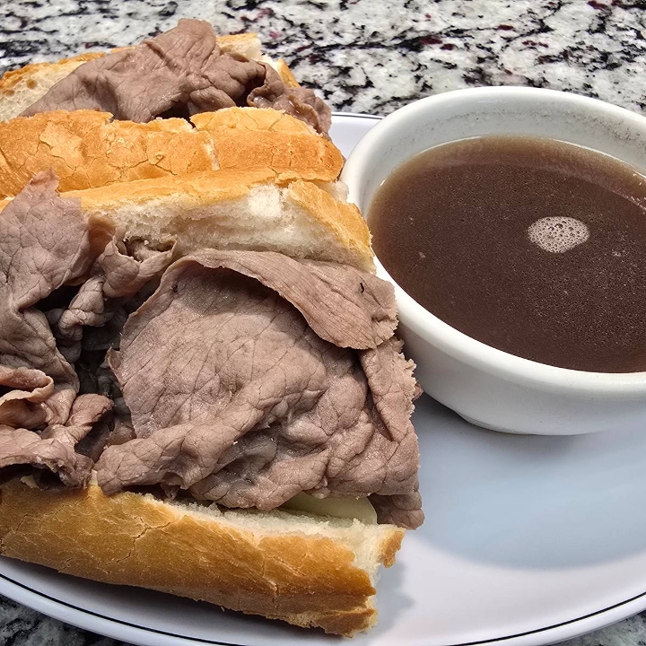 Hot roast beef dipped in homemade au jus, & imported Swiss cheese