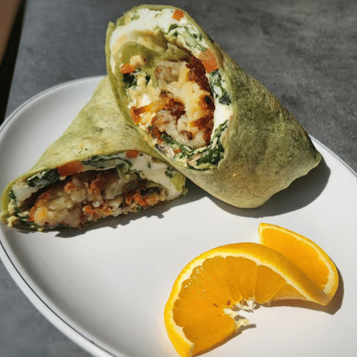 2 scrambled eggs, spinach, feta cheese, red onion, roasted tomato