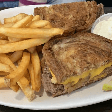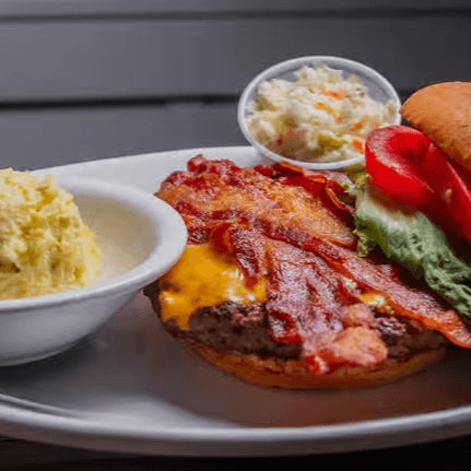 BBQ sauce, bacon, grilled onions and mozzarella cheese with your choice of one side