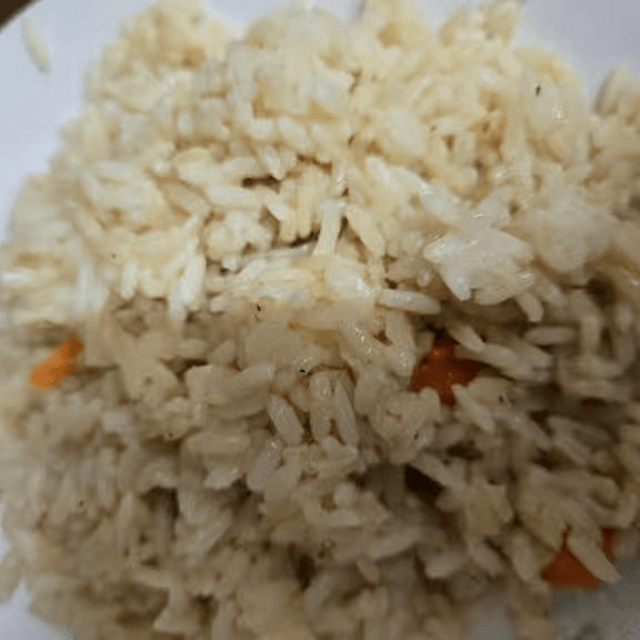 Rice pilaf, carrots, onions, snap peas, mushrooms, broccoli, celery and teriyaki sauce