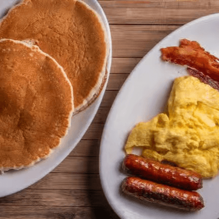 2 eggs, 2 pancakes, 2 bacon strips, 2 sausage links