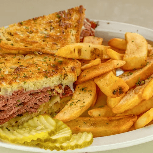 Corned beef or pastrami, Swiss, sauerkraut and 1,000 island dressing served with French fries