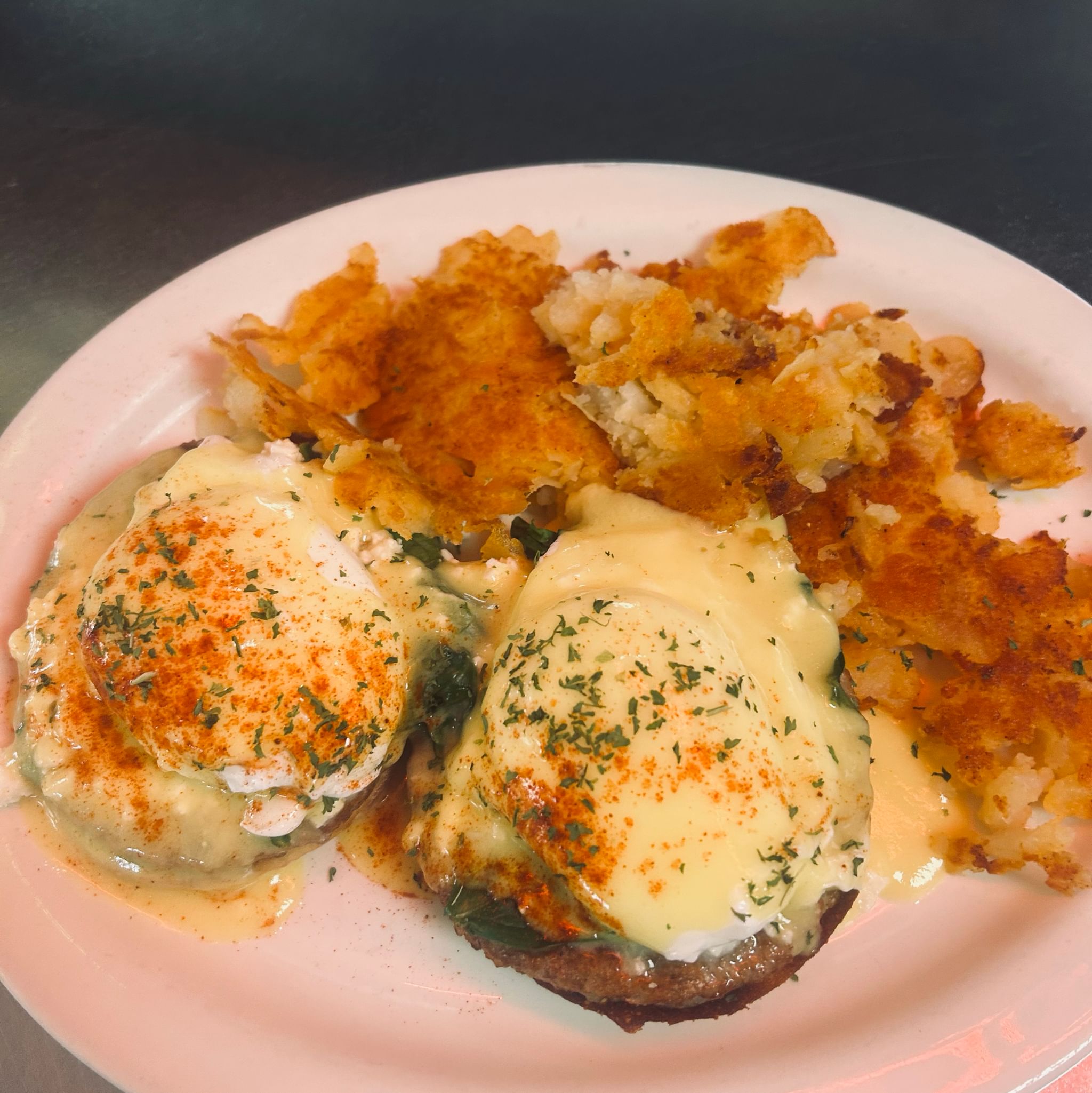 Crispy krab cake, egg, topped with hollandaise sauce and avocado